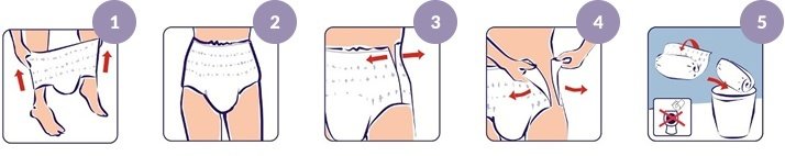 Indicatorul de umiditate oferă informaţii despre necesitatea schimbării produsului, iar inscripţia „FRONT” indică partea din faţă a chilotului.